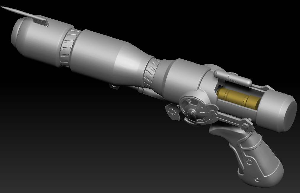 Here's the progress on the Caster. There probably doesn't appear to be a whole lot of extra content added since yesterday; the majority of detail was added to the inside of the shell chamber. The gun overall could certainly be more detailed but I'm getting tired of looking at it, and having to fight with ZBrush isn't helping much so I'm going to move on. I'll have plenty more opportunities to make more, and expectedly better portfolio pieces over the next year. Spending forever on this won't do me any favors in the grand scheme of things.