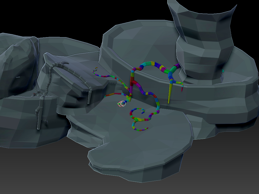 Today is the day of the vine, I'm blocking in all the vines for the whole level, woo! Then I'll make a seamless vine texture and throw it on all of them, real quick and easy.