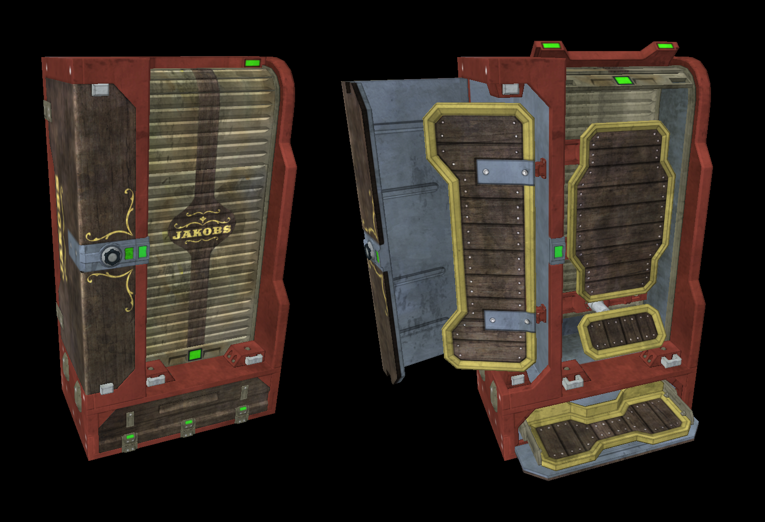Inking to come tomorrow, I tweaked the base colors tonight instead. Here's a shot of closed/open base color + grime, without inking: